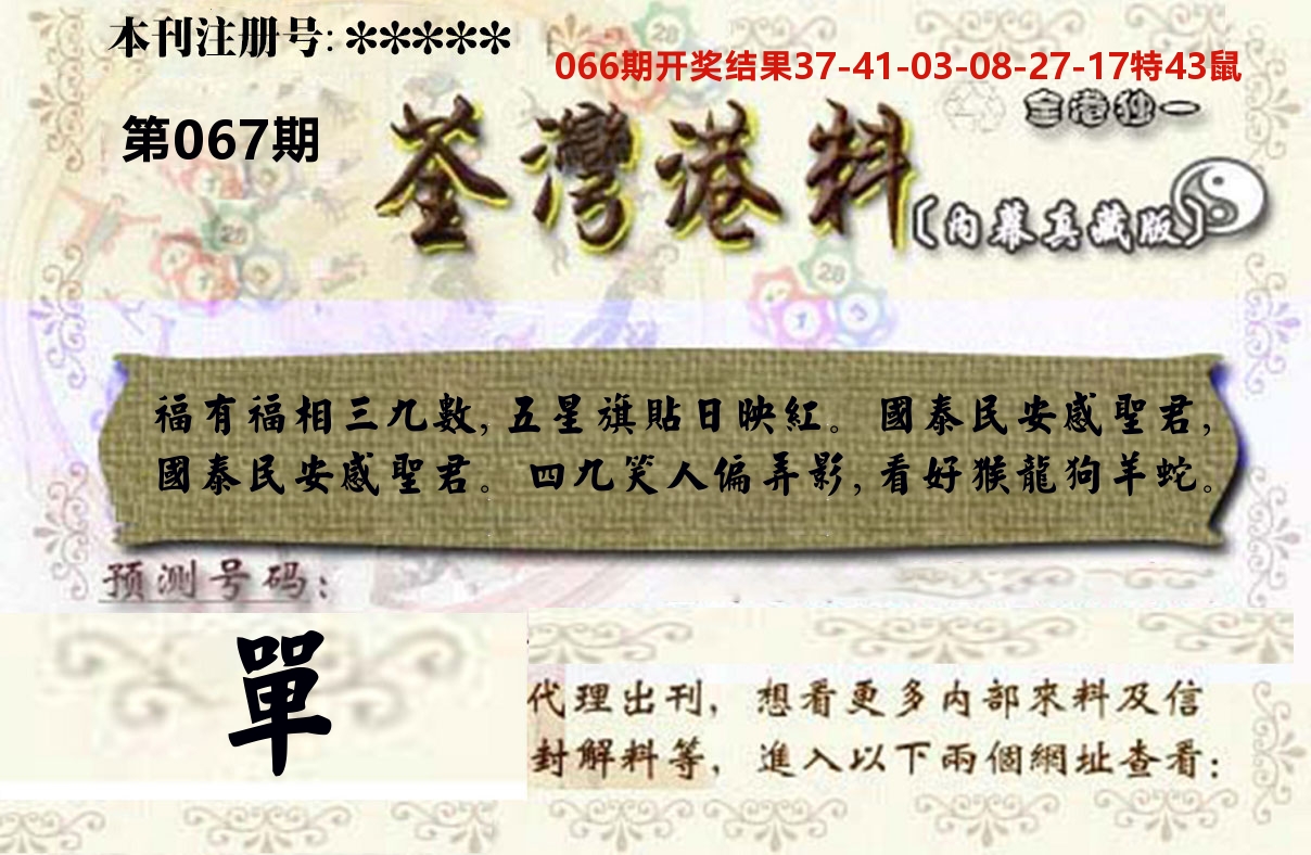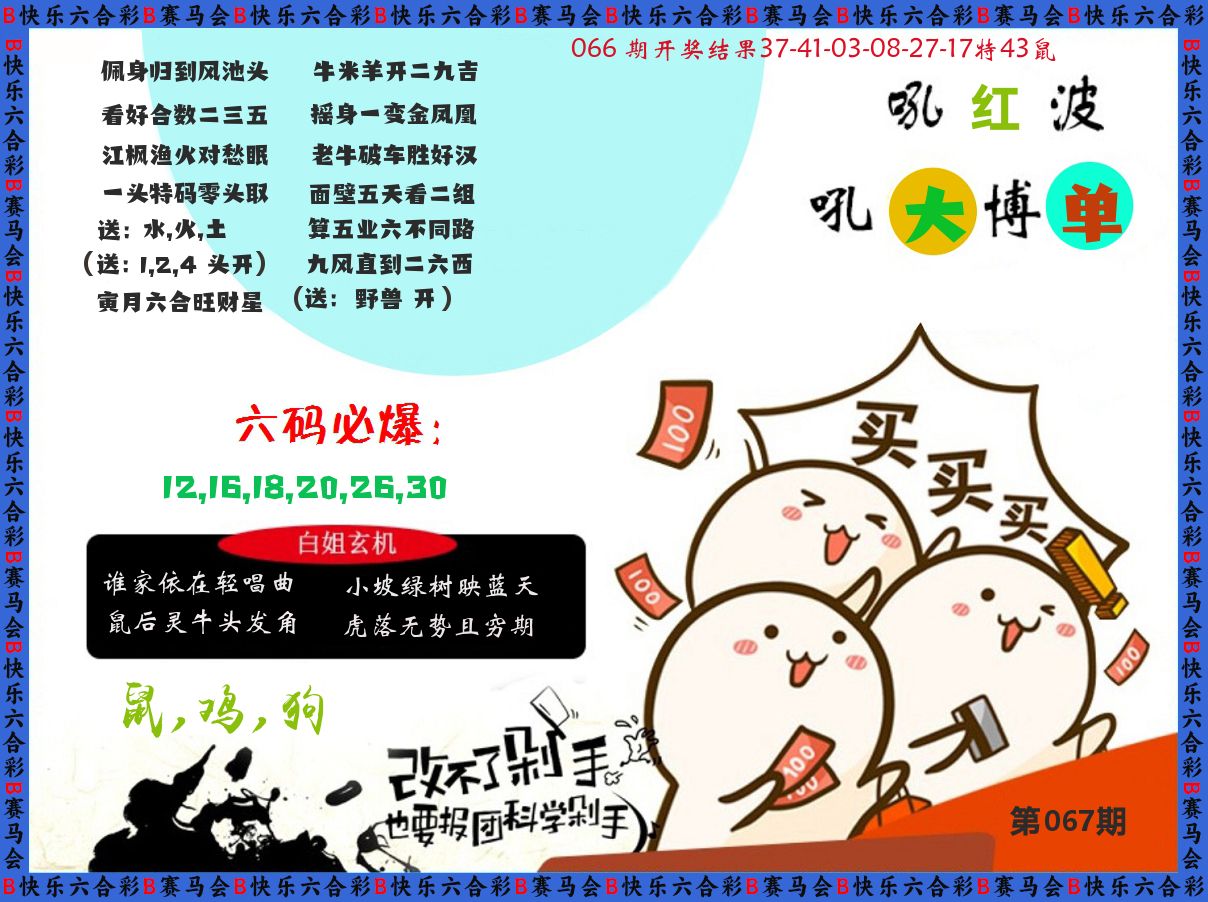 066期精选⑥肖:【羊狗马牛猴鼠】开 鼠43 准